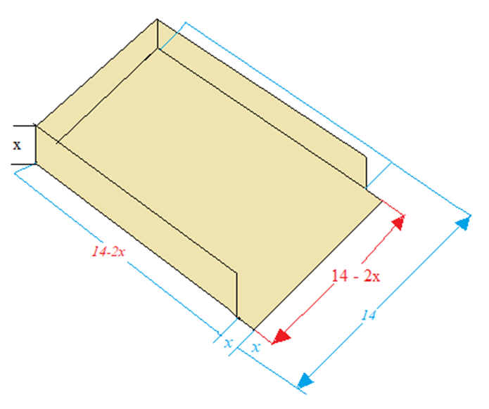 Entonces, si cortamos las esquinas cuadradas y doblamos la hoja para crear la caja, nuestros lados tendrán una longitud de 14 – 2x ya que sacamos una pieza de cada esquina con una longitud de x; y nuestra altura será x. Ahora nuestra caja tridimensional tiene las siguientes unidades.